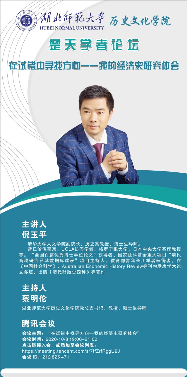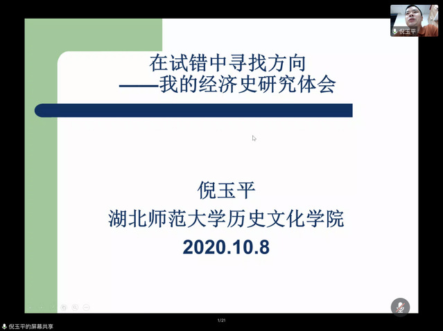 10月8日晚,一场主题为“在试错中寻找方向——我的经济史研究体会”的线上讲座利用腾讯会议平台召开。主讲人清华大学人文学院副院长、博士生导师倪玉平教授从切身经历出发为万象城研究生开展一场别开生面的“云”讲座。本次讲座由万象城awcsport官网党总支书记蔡明伦教授主持,万象城awcsport官网副院长李柏林教授、学科带头人张泰山教授等多位老师和全体研究生参加。