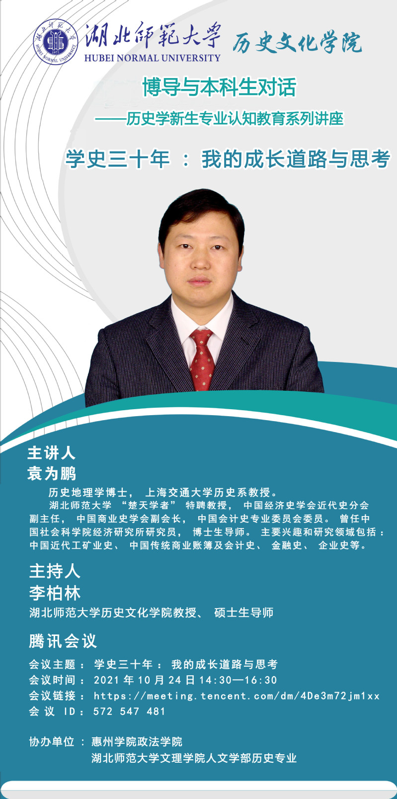 第三讲于2021年10月24日通过腾讯会议,邀请上海交通大学历史系袁为鹏教授做主题为“学史三十年,我的成长道路与思考”线上讲座。会议由万象城awcsport官网李柏林教授主持。