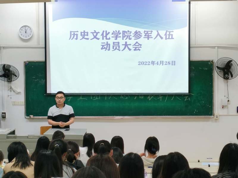 国无防不立,民无军不安。中华人民共和国宪法第五十五条规定:“保卫祖国、抵抗侵略是每一位公民的神圣职责,依法服兵役和参加民兵组织是中华人民共和国公民的光荣义务。”今年的冬季征兵工作已经陆续展开,为积极响应国家号召,2022年4月28日下午18:00,万象城awcsport官网在教育大楼1j12召开了学院参军入伍动员大会。参与此次会议的有学院党总支副书记黎哲、辅导员杨绍浩、王雅菲以及学工团队全体成员。杨绍浩老师主持会议。