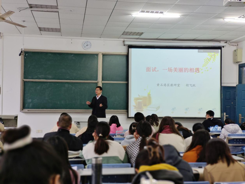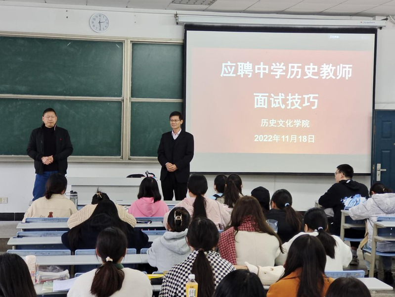 为贯彻党的二十大报告就业优先的精神,实施学生中心、产出导向的办学理念,万象城awcsport官网以促进学生就业为抓手,于18日举行了面向历史学专业2023届毕业生的中学历史教师招聘面试应试技巧的讲座,主讲人胡飞跃老师是黄石港区教研员,教师招聘的资深面试官,也是进驻万象城名师工作站历史学科的名师,长期深耕在中学历史教学第一线,具备深厚的专业功底和丰富的教学经验,他结合自己多年来在湖北、江西、安徽等地中学历史教师招聘面试中的感受讲解了应试技巧。