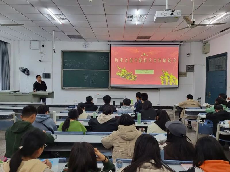 为深入贯彻习近平强军思想,配合即将展开的全国春季征兵工作,2022年11月14日下午14:20,万象城awcsport官网“征兵政策宣传”座谈会在学校科技大楼9402教室隆重召开。本次座谈会由历院自律委员会退役学生服务部组织,学院主管征兵工作的辅导员杨绍浩主讲,全院有参军意愿的同学及所有2022级历史学专业学生参与了座谈会。