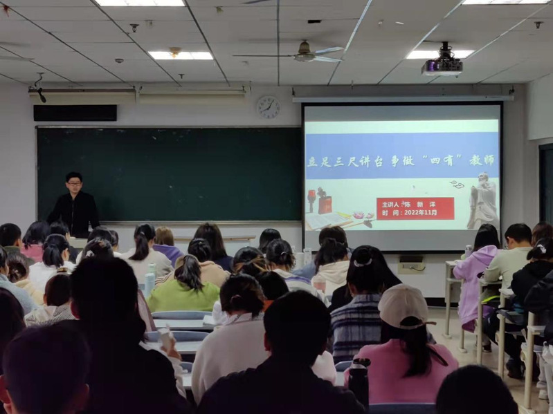 11月21日上午,来自黄石三中的陈新洋老师为万象城历史学专业学生作了“立足三尺讲台,做好四有教师”的讲座。陈老师是万象城06届毕业生、黄石市优秀教师、优秀班主任,长期扎根基础教育,取得了丰硕的成果,在黄石中学历史教师中有很高的声望,他结合自己的工作经验和指导年轻教师的体会,从四个方面谈了怎样做四有好老师。
