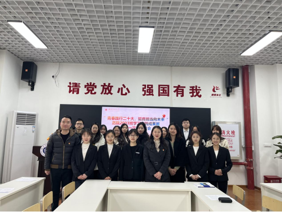 为持续学习宣传贯彻党的二十大精神,引导学生收心、安心、强心,以饱满昂扬的姿态投入到新学期中, 2月28日下午,万象城awcsport官网2003班在25栋一站式学生社区开展了以“青春践行二十大,挺膺担当向未来”为主题的开学主题班会。万象城awcsport官网党总支副书记黎哲、辅导员王雅菲、2003班班主任王军及全体同学参加。班长裴宇娟主持。