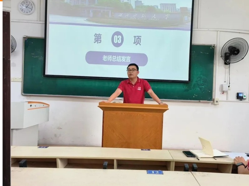 会议第三项,辅导员杨绍浩老师和郑甜甜老师上台发言。首先强调本学期新学工团队要尽快了解工作重点,以便积极应对工作安排。其次本学期即将迎来新生入园,同学们要做好迎接准备,为新生创造一个良好的湖师印象,新媒体的同学们要做好宣传工作。最后告诉同学们在迎接新生时,不仅要展现湖师人热情,友爱,同时也要注意自己的身体状况。