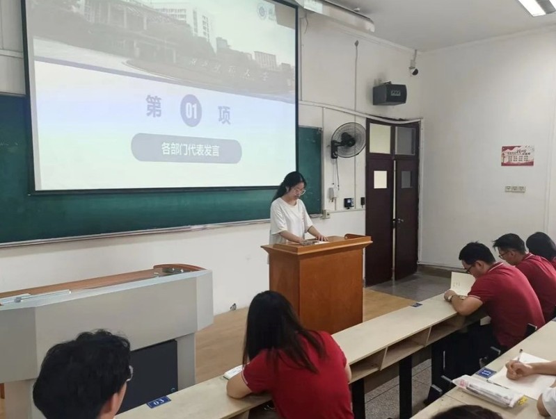 会议第一项,团学自各部门代表依次上台发言,简述本部门主要负责的工作内容的同时,汇报新学期工作计划。