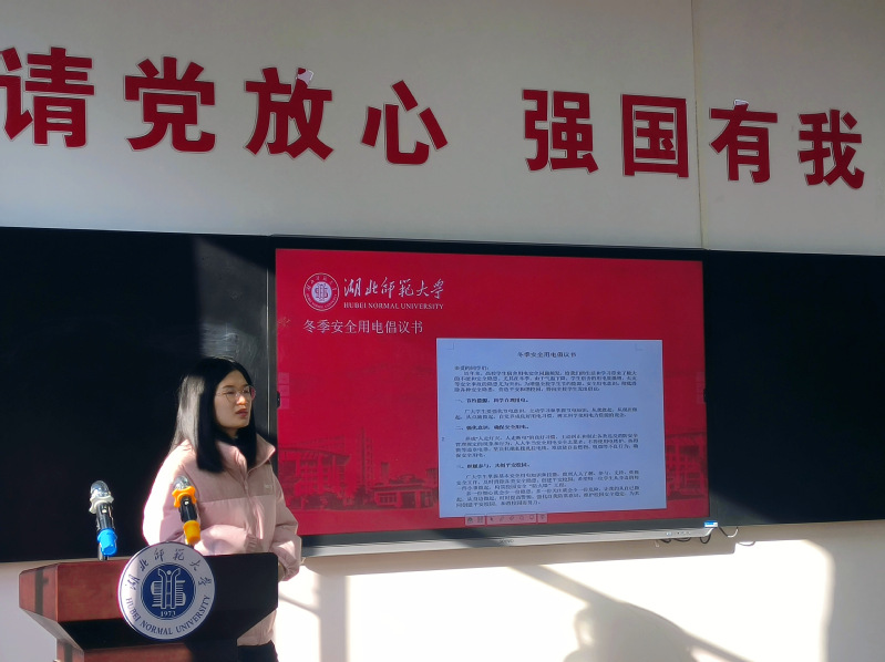 随后,郑甜甜老师就加强学生安全防范意识,对学生寝室用电规范做出了具体要求,向同学们展示《冬季安全用电倡议书》,并通过“节约能源,科学合理用电”“强化意识,安全用电”“积极用电,共创平安校园”三点向同学们发出倡议,要求同学们要克服松懈心理,强化安全防范意识,共创平安校园。