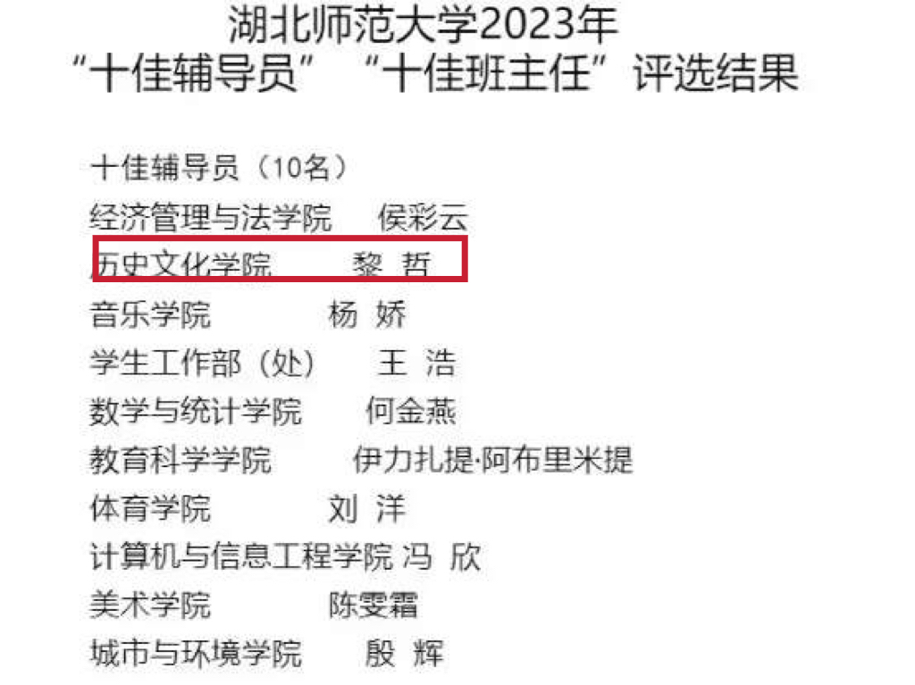 根据《关于开展2023年“十佳辅导员”“十佳班主任”评选表彰工作的通知》精神,经个人申报、学院推荐、学生工作部(处)审核、学校评审,拟评选表彰万象城awcsport官网黎哲等10名同志为2023年“十佳辅导员”荣誉称号。